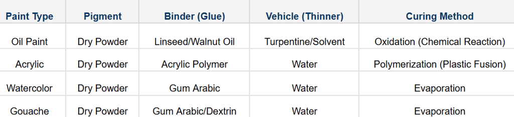 If you walk into an art store, the options can feel overwhelming: rows of Oil, Acrylic, Watercolour, Gouache, Tempera, and Encaustic. But chemically speaking, they are all the same thing.